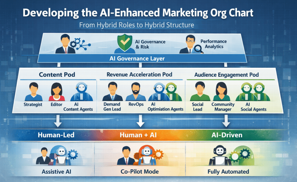 This post explores how marketing leaders can move beyond adding AI tools to individual roles and instead redesign their entire org structure for hybrid human-AI collaboration. It outlines how to embed autonomy intentionally, redefine management responsibilities, and introduce governance to scale AI safely. It is a practical framework for CMOs to design an AI-enhanced org chart that drives efficiency, accountability, and long-term growth.